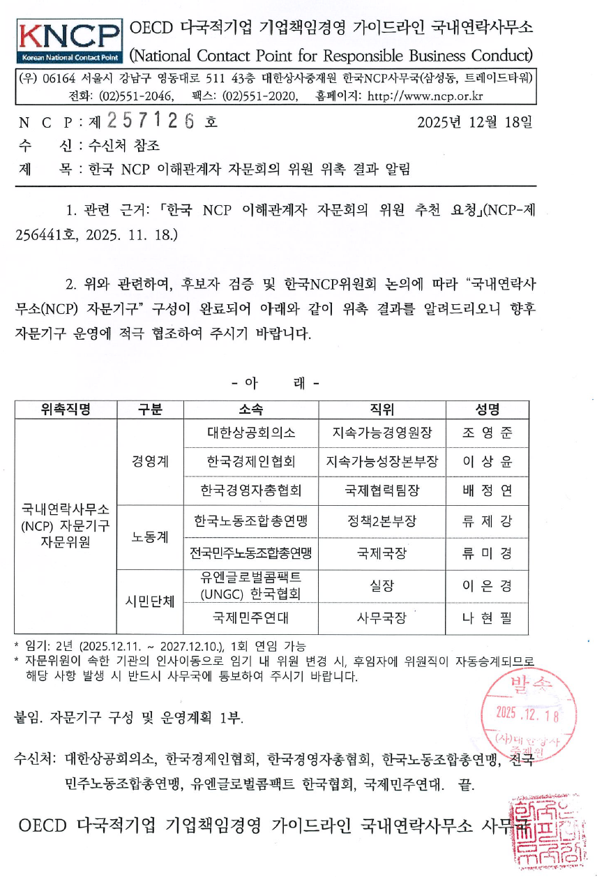 (2025.12.18.) 기업책임경영 국내연락사무소(NCP) 자문기구 위원 구성 통보